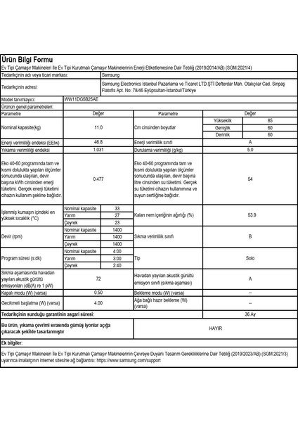 Samsung WW11DG5B25AEAH A Enerji Sınıfı 11 kg 1400 Devir Çamaşır Makinesi